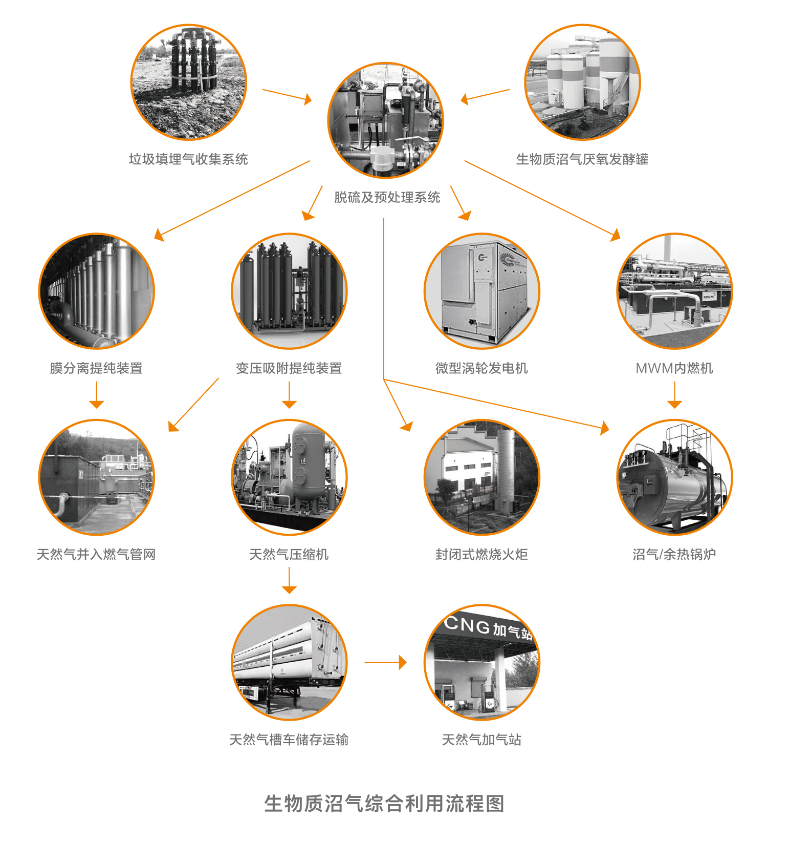 吉成環境專業承接沼氣收集、脫硫凈化、燃燒和沼氣發電、沼氣提純等系統工程,提供從沼氣收集-氣體凈化提純-生物天然氣加氣站建設運行的全流程解決方案,用先進的技術幫助企業解決環境污染和能源利用問題,降低運營成本,提高經濟效益。除提供生物質沼氣資源化利用解決方案外,還以EPC、BOT、BOO、BT的商業模式參與生物質沼氣的開發利用。