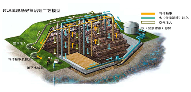 好氧生物反應器技術(shù)是一種在好氧條件下通過生物降解治理生活垃圾的一種技術(shù)。其基本原理是將垃圾填埋場視為一個巨大的容器,使用高壓風機,通過管道和注氣井,向垃圾填埋場中注入空氣,空氣中的氧參與垃圾中有機質(zhì)的降解反應,在氧氣和水的參與下,通過以好氧為主的生物反應,輔以化學、物理、生物化學反應,使垃圾中的可降解有機物快速降解,從而使垃圾堆體達到穩(wěn)定狀態(tài)。