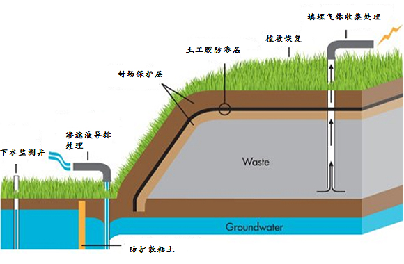 填埋場封場技術(shù)是指通過工程手段,將不再使用的固廢填埋場隔離成一個封閉獨立的單元,外界雨水和地下水不再進入堆體,堆體內(nèi)產(chǎn)生的廢水和廢氣等污染物進行有序?qū)藕吞幚恚固盥駡霾辉傥廴局苓叚h(huán)境。