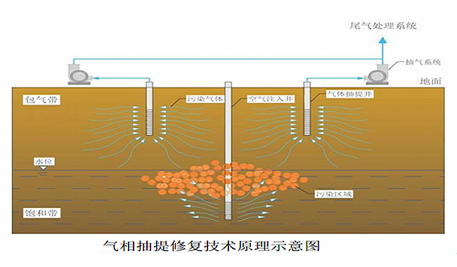 技術(shù)原理:土壤氣體抽提技術(shù)是通過在不飽和土壤層中布置提取井,利用真空泵產(chǎn)生負壓驅(qū)使空氣流通過污染土壤的孔隙,解吸并夾帶有機污染物流向抽取井,最終在地上進行污染尾氣處理,從而使污染土壤得到凈化的方法。