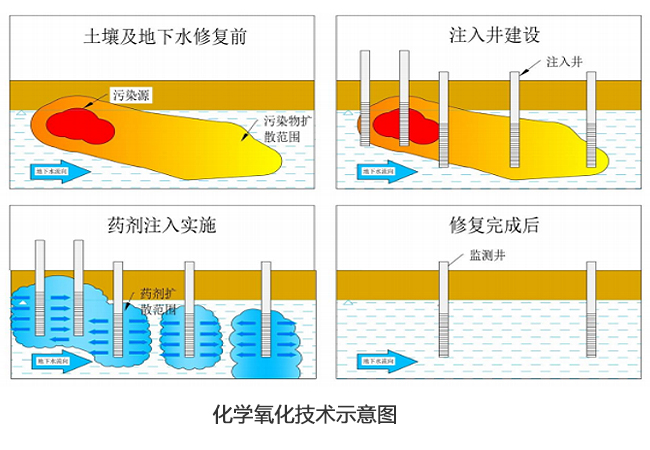 技術(shù)原理:化學氧化技術(shù)主要是通過向土壤中添加氧化劑的方式把土壤中的污染物氧化為低毒、易生物降解的物質(zhì)或者直接把污染物降解,將存在與土壤和水中的污染物降解為小分子,反應完全生成無害的二氧化碳、水和其他鹽離子等,徹底去除污染物。