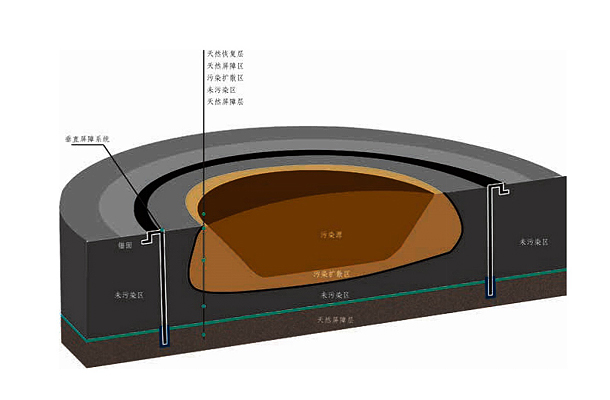 采用垂直防滲必須利用場地底部的天然相對不透水層作為底部防滲層,垂直防滲結構底部深入天然相對不透水層一定深度,從而使場地形成一個完整的相對獨立的水文地質單元。